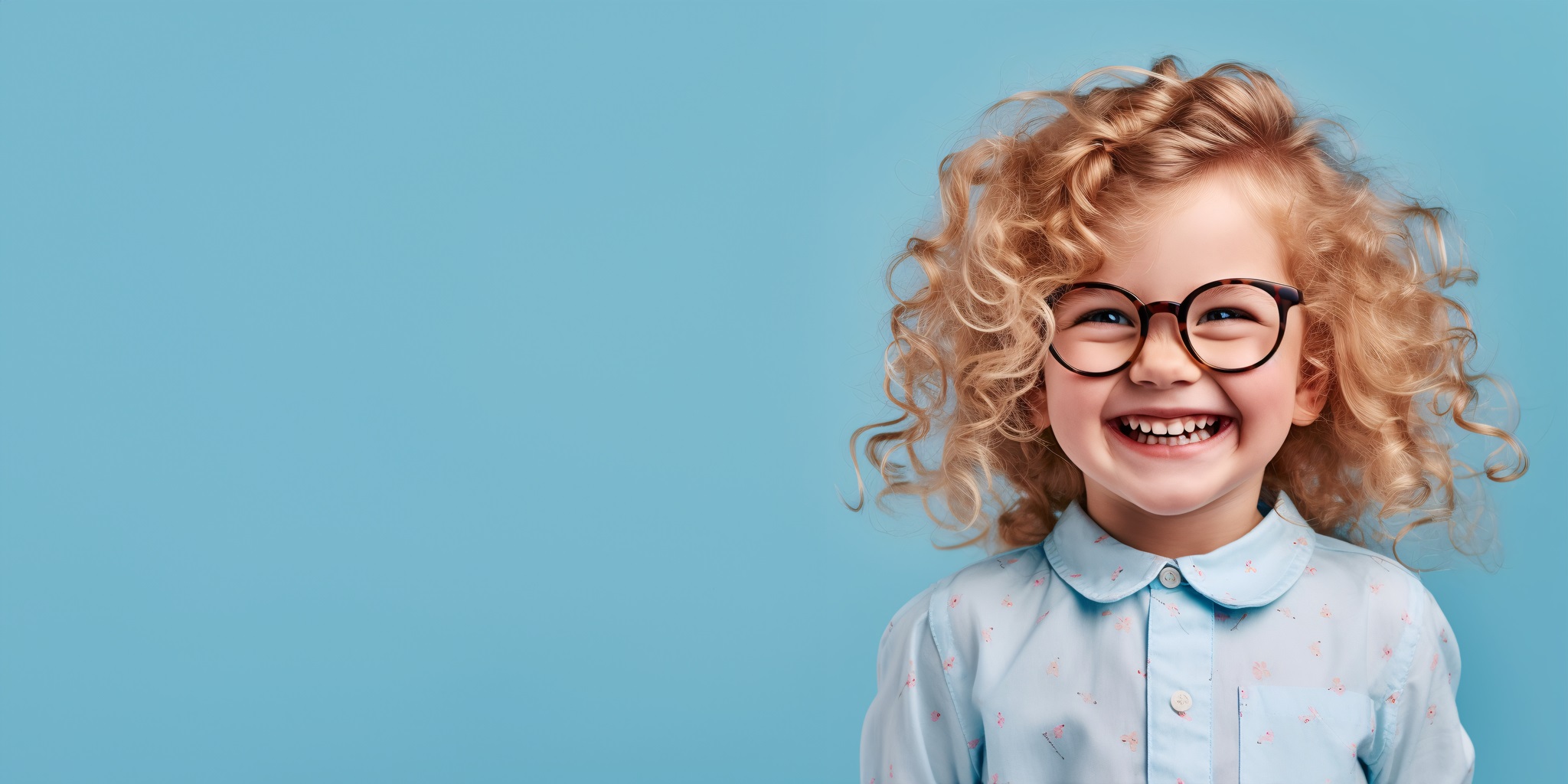 Happy little curly blond girl with big eyeglasses. Isolated on solid blue background